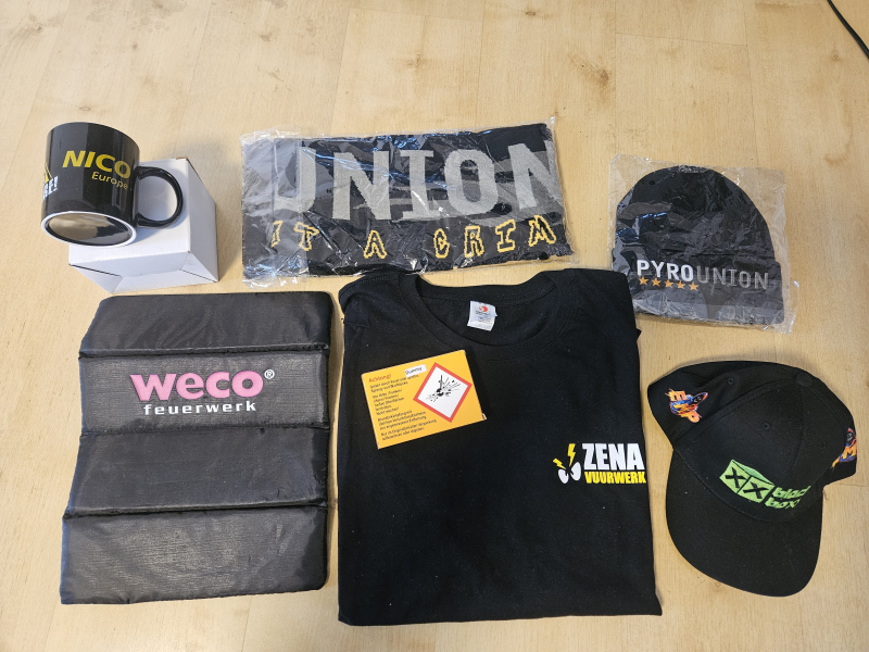 1X Nico Tase - 1X Pyro Union Schall - 1X Pyro Union Mütze - 1X eine Art Weco Sitzkissen - 1X Zena T-Shirt 2XL -1X Kappe Blackboxx - 1X Paukenschlag Dummys Ausstellerware.