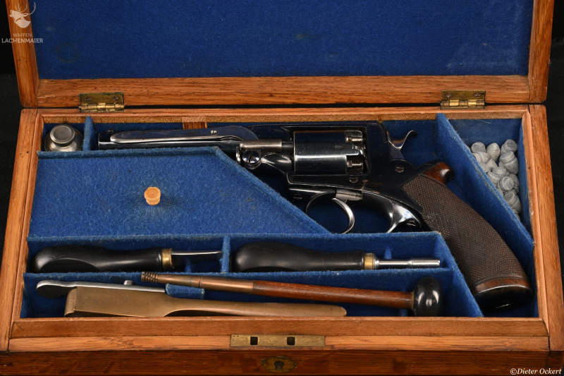 With blued octagonal sighted barrel stamped 'L.A.C.' along one side, blued top-strap engraved with retailer's name and Address, blued serial numbered cylinder, blued border engraved frame with serial numbers and 'Adams' Patent' on the right side, blued safety-stop, bright arbor pin, rammer, hammer and trigger, blued trigger-guard and butt-cap, chequered figured rounded butt, and nearly all its original finish: in original fitted oak case lined in blue baize with accessories including G. & J.W. Hawksley powder-flask (some loss of finish), and brass bullet mould stamped with retailer's name and address, the exterior with circular brass escutcheon engraved with owner's monogram 'EB', London proof marks 11.2 cm. barrel