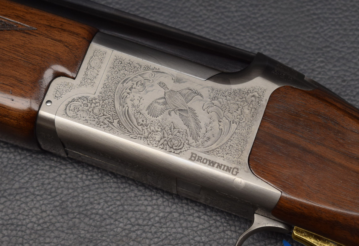 Silbernitrit-Finish ver­sehen. Sie trägt eine elegante Jagdgravur, umrandet von leichten Arabesken.