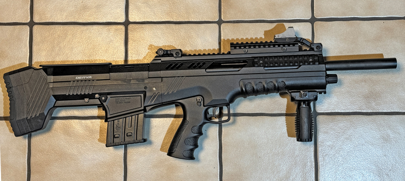 Die BULLPUP von DERYA ist eine halbautomatische Flinte im Kaliber 12/76. Eine SL-Flinte in futuristischem Design, die man in dieser extravaganten Optik nur selten sieht. Die Schrotflinte mit Stahlschrotbeschuss ist kurz und führig, präzise und überzeugt durch Ihre einfache Handhabung. Dank der 20 cm langen Picatinnyschiene sind Sie flexibel bei der Verwendung diverser Zieloptiken. Die abnehmbare Klappvisierung ist jedenfalls von Haus schon dabei. Auf Wunsch kann das Red Dot Visier mit Montage für 150 € mit erworben werden.