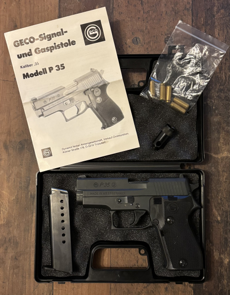 Zum Verkauf aus meiner privaten Sammlung kommt eine Geco P35 im starken Kaliber .35 Knall mit der PTB Nummer 456. Beschussjahr ist KB gemäß Stempelung.