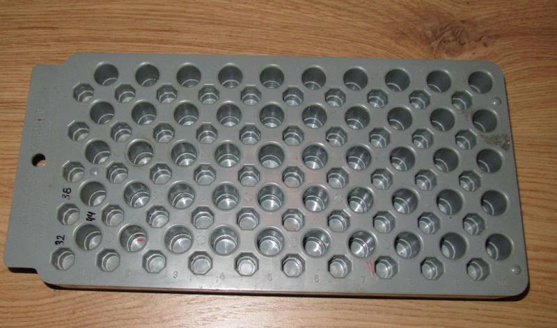 1. Seite / Vorderseite: die 6-eckigen Löcher sind für .38/ .357 zugeschnitten, die großen runden Löcher haben 13 mm Durchmesser (nach unten geringfügig enger werdend), die nehmen alle gängigen Gewehr-Kaliber auf, also .222, .223, .270, .308, .30/06; .375H&H, .338 Magn., .300 Win. Mag., 7mm, .264 Mag., .30/30. Es passen aber auch .44Mag. und .41.Mag.
