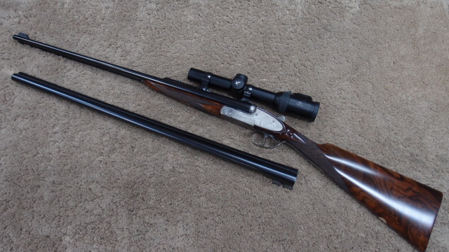 Sie bieten auf eine sehr schöne Kombination aus Doppelbüchse mit Wechsellauf Doppelflinte der Firma Parthoens aus Belgien. Diese Kombination befindet sich in einem sehr guten Zustand! Der Doppelbüchslauf im Kaliber 8x57JRS ist 62cm lang, von innen und außen wie neu und trägt ein neues Swarovski Z8i 1-8x24 (LD-I) auf SEM. Seine Schußleistung ist sehr gut mit RWS HIT. Das Doppelflinten Laufbündel im Kaliber 20/70 ist ebenfalls wie neu und 70cm lang. Es hat 1/2 und 1/1 Chokebohrungen. Das System trägt eine sehr schöne Gravur und hat Seitenschlosse sowie Ejektoren auf beiden Laufbündeln. Der Schaft misst 37,5cm (1. Abzug bis Mitte Kappe) und hat kaum Gebrauchsspuren. Zu der Kombination gehört ein Lederkoffer. Die Doppelbüchse ist gesamt 106cm lang bei 4250g mit ZF und 3600g ohne ZF. Die Doppelflinte ist gesamt 114cm lang bei 2800g Gewicht. Weitere Bilder gerne auf ernst gemeinte Anfrage. Viel Erfolg beim Bieten! ***Wir wünschen Ihnen ein schönes Weihnachtsfest und alles Gute, viel Gesundheit, Glück und Waidmannsheil für 2026!*** Jagd Lübbers, info@jagdluebbers.de