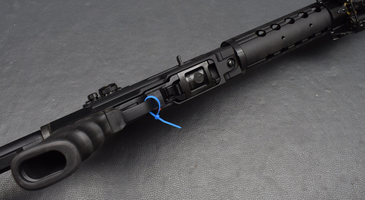 Knopfsicherung am Abzugsbügel, Montiert mit Picatinny-Schiene.