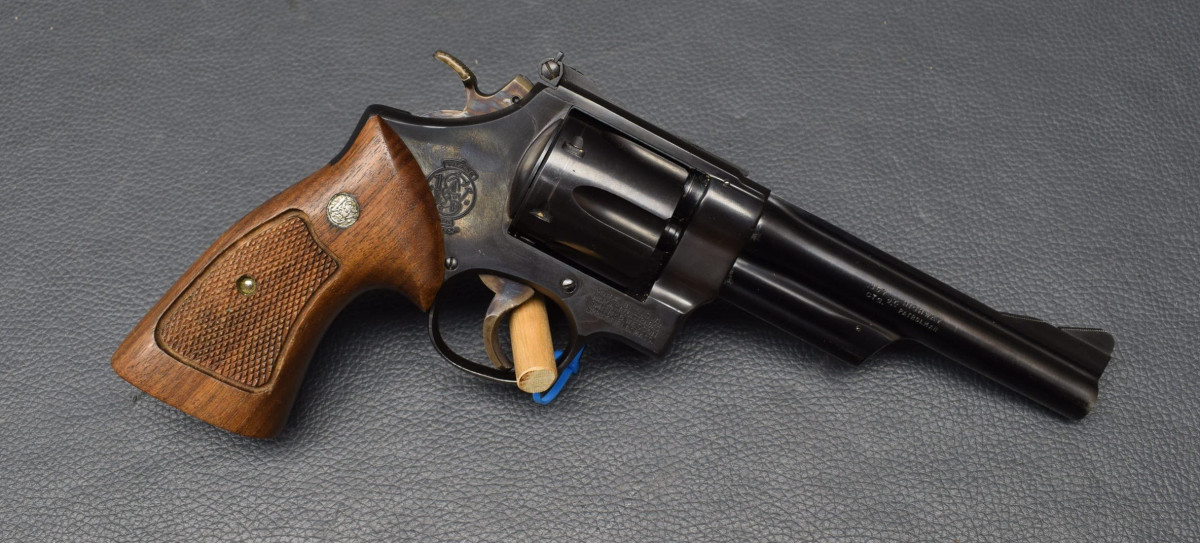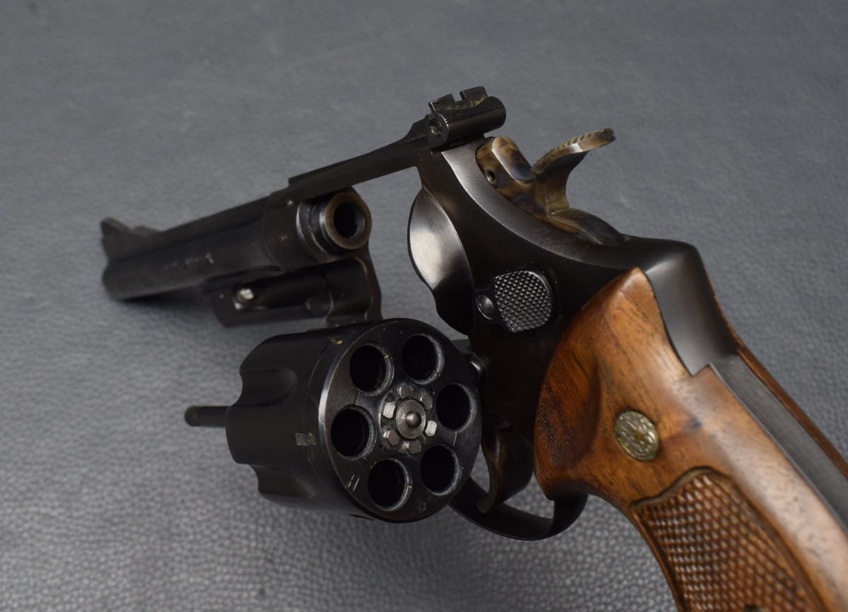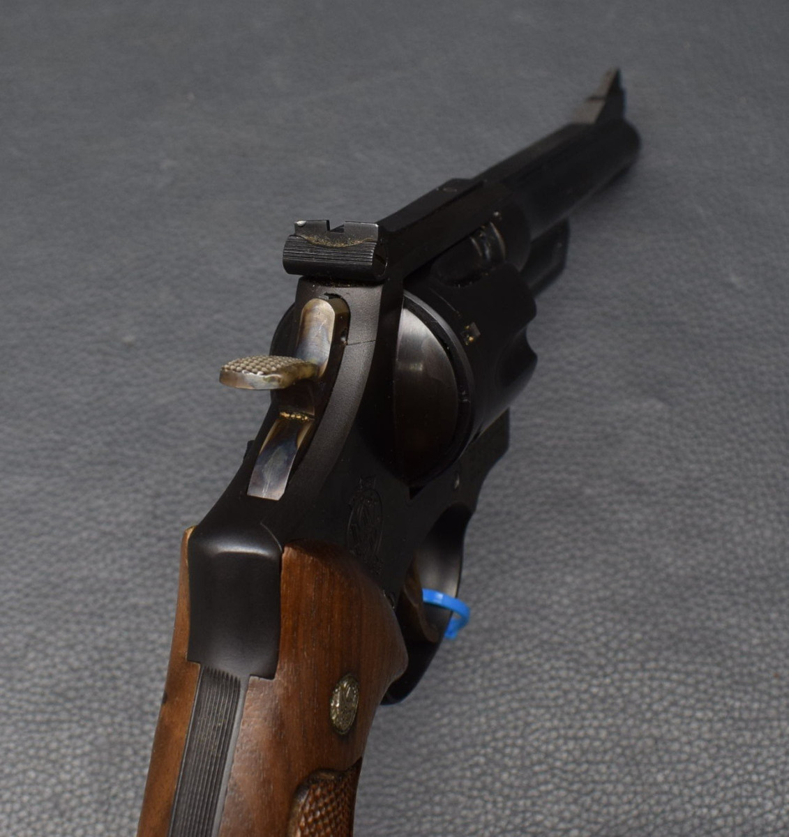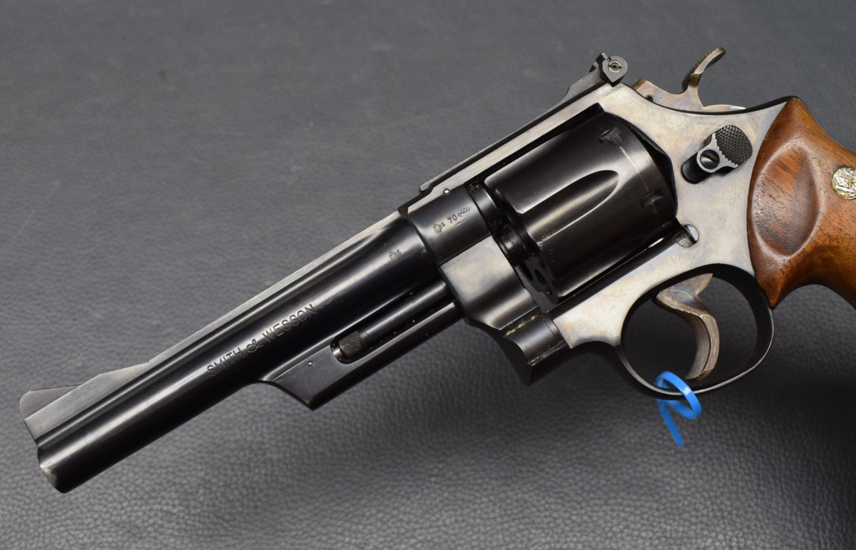 SA/DA Abzugssystem, N-Rahmen, 6-Schuss Trommel, Holzgriff mit Fischhaut und S&W Logo.