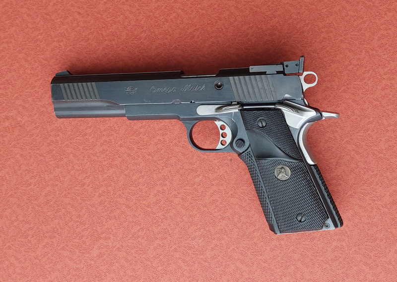 Eine Match-Pistole von Hersteller "KPS" - Mod. Omega Match / Kal.: 9mm Luger / Griffstück von Springfield / mit oberflächigen Gebrauchsspuren, an zwei Stellen Narben vom Lagern (siehe auf Foto) / Lauflänge ist 6" (152mm) / der Lauf ist innen gut, die Züge sind scharf / Magazin fehlt, es passen aber 1911-Magazine / mit einsellbarem Matchabzug /