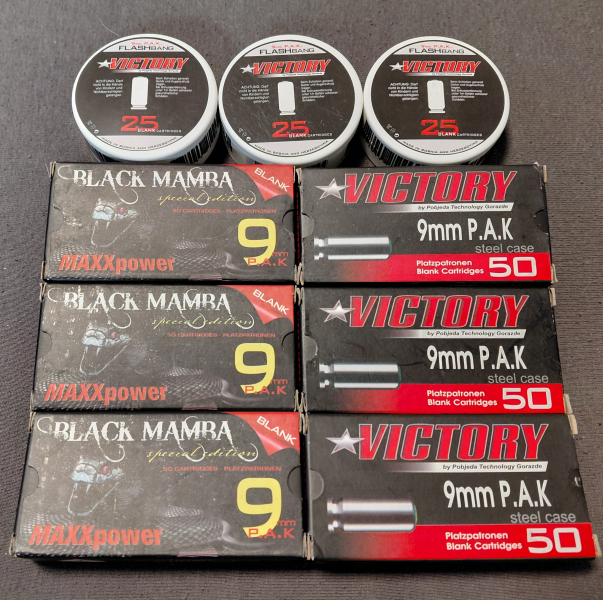 Zum Verkauf stehen 3x Päckchen Victoy Flashbang Patronen, 3x Päckchen Black Mamba und 3x Packchen Victory Platzpatronen P.A.K Siehe Bild.