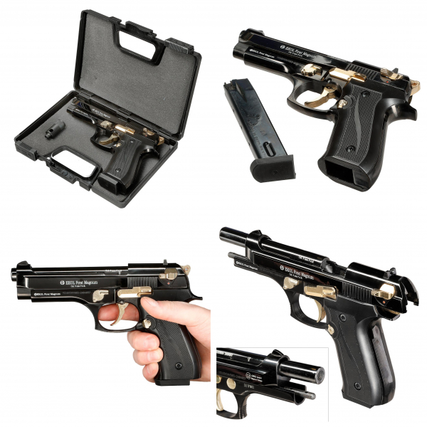 Die Ekol Firat Magnum Schreckschusspistole in schwarz mit vergoldeten Applikationen ist eine gut verarbeitete Gas-Signal-Pistole aus Stahl.