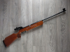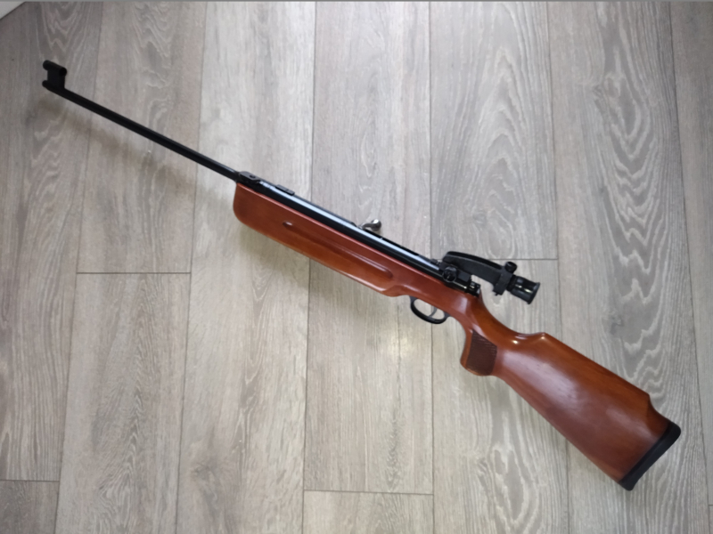 Einzellader Luftgewehr, mit starrem Lauf und Ladehebel für Diabolo im Kaliber 4.5 mm, Lauf gezogen, automatische Abzugssicherung, Einstellbarer Abzug, Diopter Visierung, Länge 1115 mm, Lauflänge 450 mm, Gewicht ca. 3 Kg. Buchenholz Schaft.