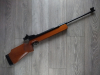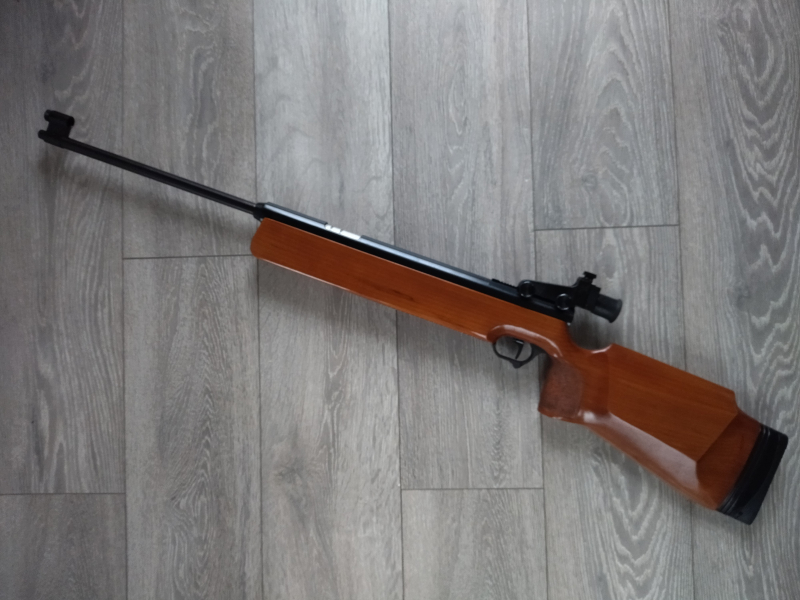 Einzellader Seitenspanner Luftgewehr, mit starrem Lauf und Ladekammer für Diabolo im Kaliber 4.5 mm, Lauf gezogen, Einstellbarer Abzug, Diopter Visierung, Länge 1090 mm, Gewicht ca. 4 Kg. Buchenholz Schaft.