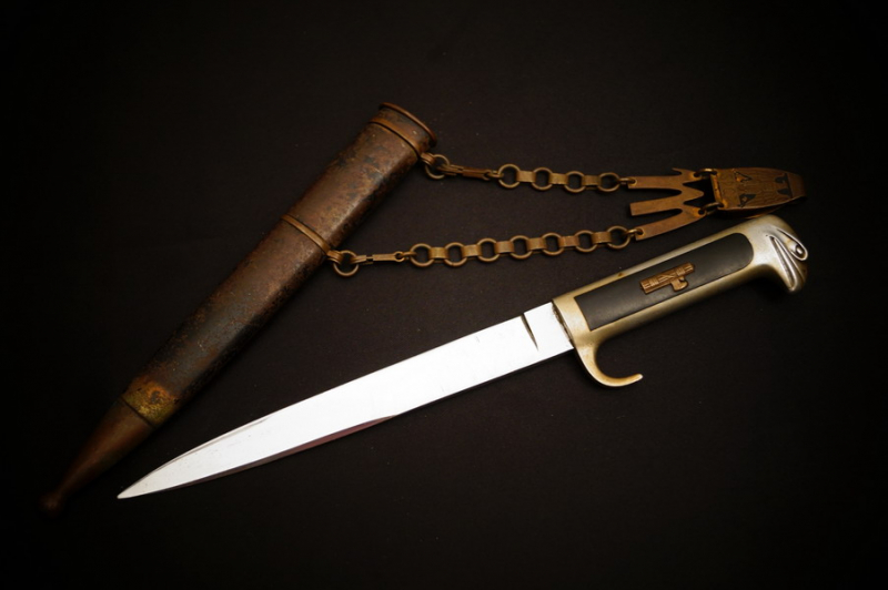 Zustand siehe Bilder. Original. Bilder sind Gegenstand der Beschreibung. Stahlscheide, mehrteilig mit Bronzebeschlagteilen. Keilformklinge mit vollständiger Vernickelung und aus Stahl. Griffstück aus Alu. Extrem selten !!!
