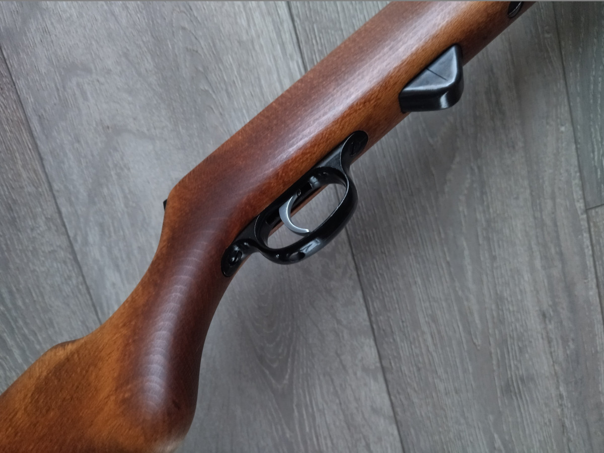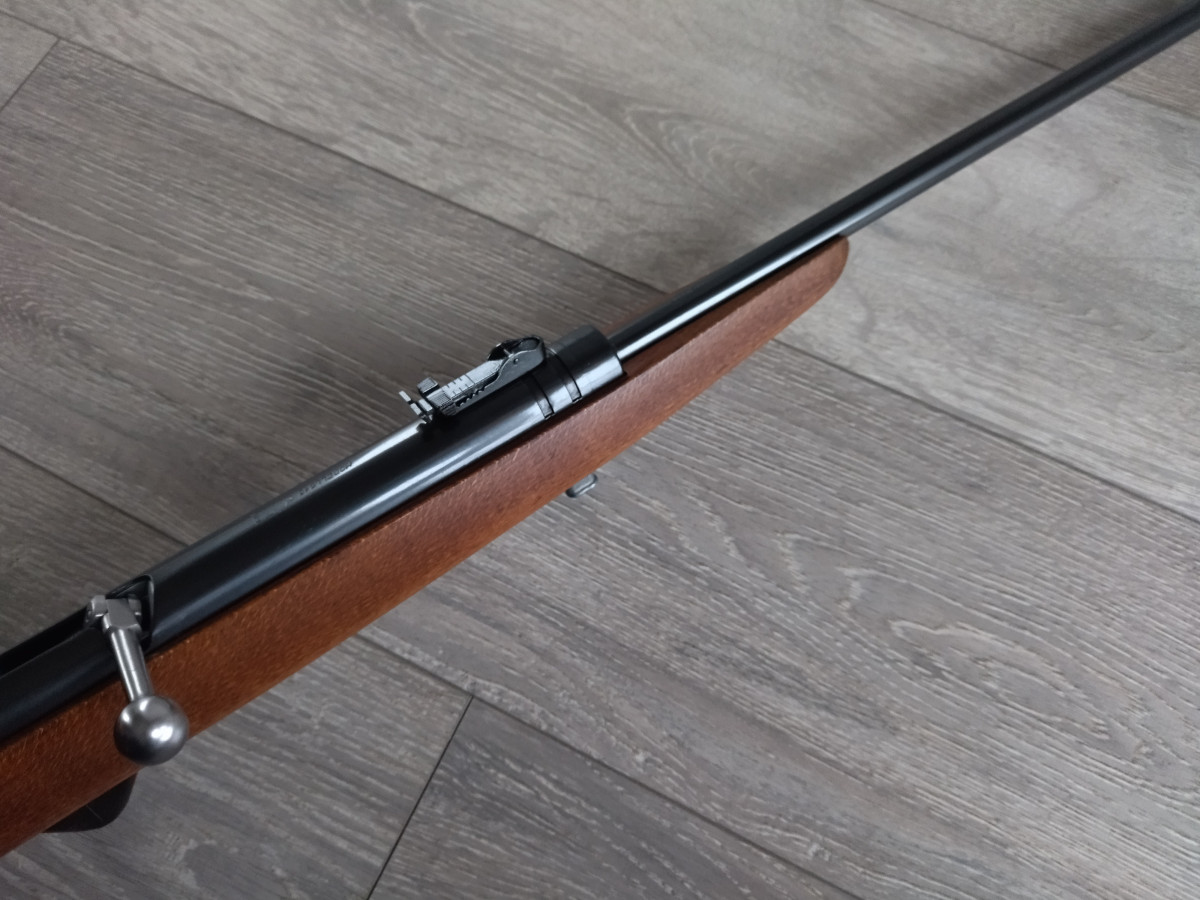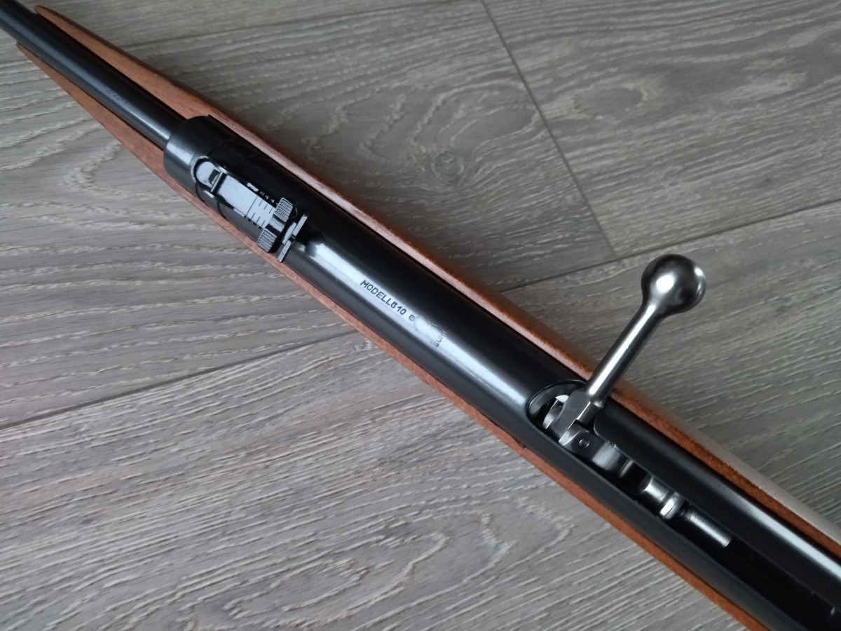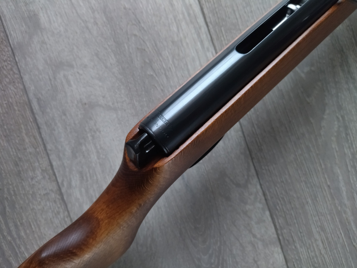 Mehrlader Luftgewehr, mit Stangenmagazin für 8 Rundkugeln im Kaliber 4.4 mm, Lauf gezogen, Einstellbarer Abzug, automatische Abzugssicherung, Länge 1080 mm, Gewicht ca. 3 Kg. Buchenholz Schaft.