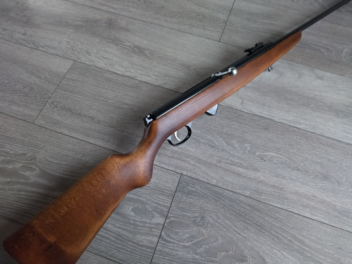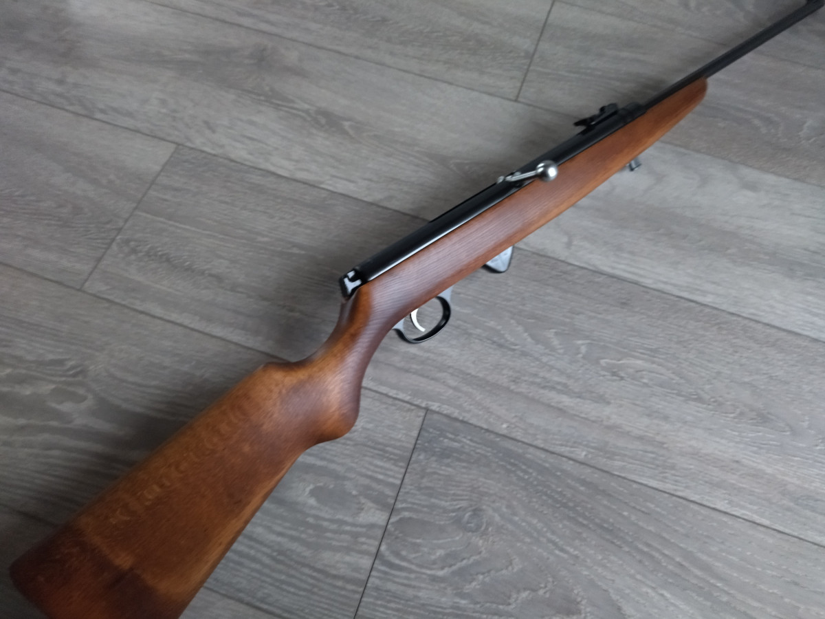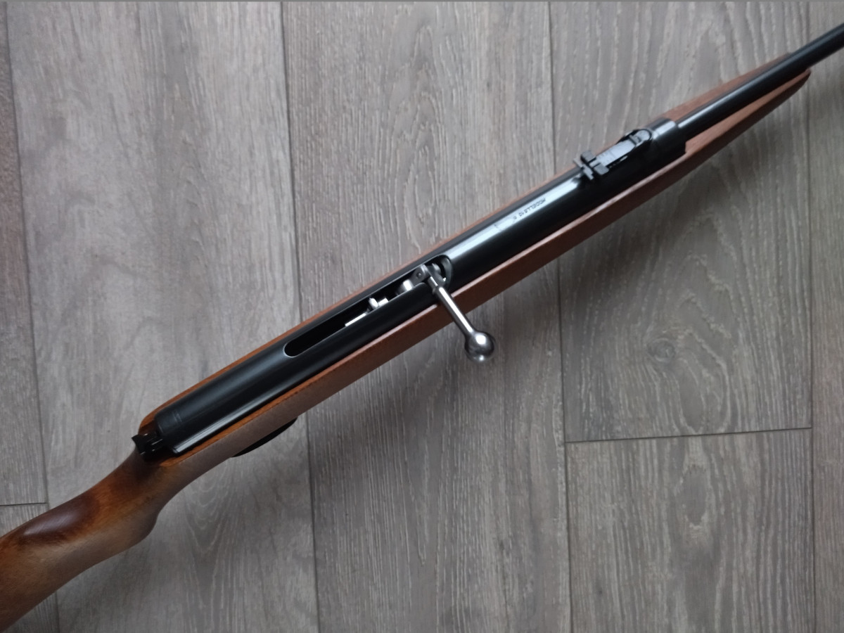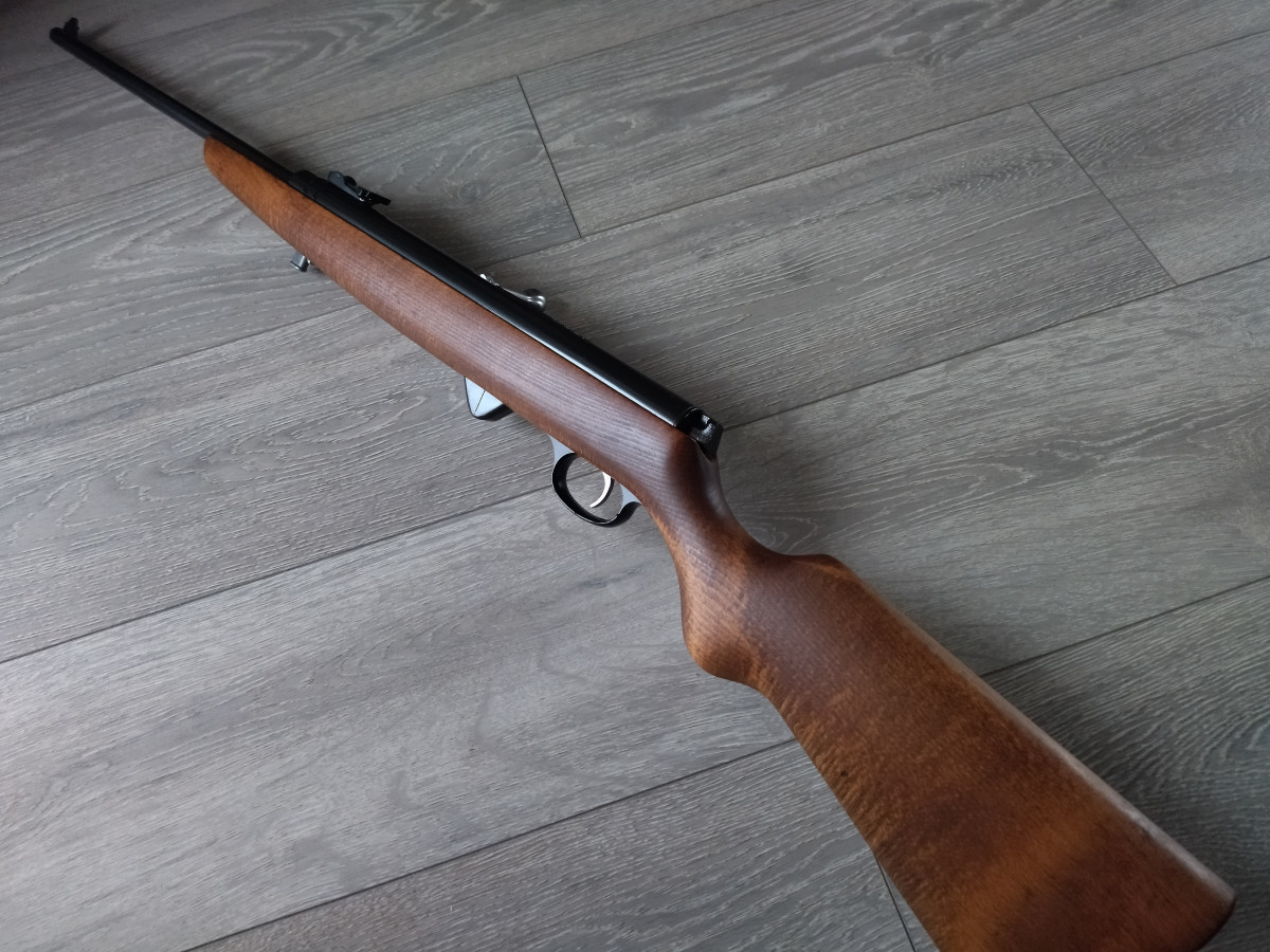Mehrlader Luftgewehr, mit Stangenmagazin für 8 Rundkugeln im Kaliber 4.4 mm, Lauf gezogen, Einstellbarer Abzug, automatische Abzugssicherung, Länge 1080 mm, Gewicht ca. 3 Kg. Buchenholz Schaft.