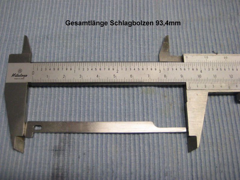 Der hier angebotene Schlagbolzen hat eine Gesamtlänge von 93,4mm und 1,85mm Stärke. Für den Wechsel des Schlagbolzen ist das Verschlussgehäuse abzumontieren, um den Verschluss entnehmen zu können. Der Schlagbolzen kann nur durch austreiben des Haltebolzen/Stift im hinteren Teil des Verschlusses freigelegt werden. Vor einlegen und verbauen des neuen Schlagbolzens, sollte die Schlagbolzenführungsrinne gereinigt und eventuell mit einer flachen Feile entgratet werden, so dass der neue Schlagbolzen bruchfrei in der Führungsnut läuft. Bitte darauf achten, dass die Schlagbolzenfeder bei Einbau wieder mit verbaut ist, da beim Ausbau/Umbau die Feder (sitzt im unteren Bereich des Verschlusses) leicht verloren geht.