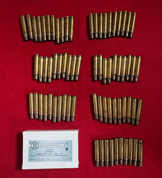 Habe insg. 800 Hülsen, 30-06 mit Berdanzündung, überwiegend AMA. Einmal abgeschossen. 740 Stück in OVP. Ich denke es sind 3 x 200 AMA und der Rest Kynoch bzw. gemischt.