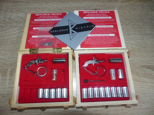 Verkaufe 2 Berloque Pistolen in silber. Das rechte Set ist neu, Leuchtkugeln, Kugeln, Munition, Ausstoßstab und Abschussbecher wie halt bei jedem neuen Berloque Set, lag seit Kauf nur in der Schublade, beim linken Set ist die Berloque defekt, aber Munition, Leuchtkugeln und Abschussbecher sind noch dabei. Aus dem Nachlass meines Vaters.