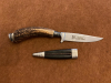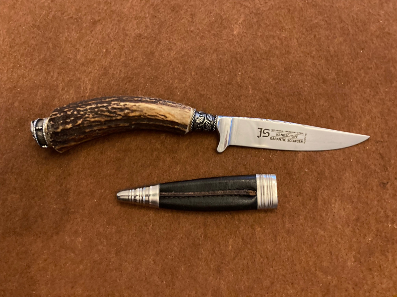 Angeboten wird ein Jagdnicker - Trachtenhosenmesser, Griff aus Geweih, Fa. JS, Molybdän-Vanadium-Stahl, Handschliff, Solingen, Zustand -siehe Bilder.