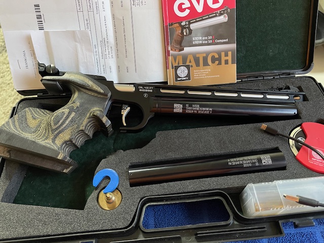 Verkaufe meine Ersatzpistole Steyr EVO 10E schwarz/schwarz. Ich habe die Pistole im Sommer gekauft und bin der zweite Besitzer. Die Pistole ist erst zwei Jahre alt und wurde bei Frankonia neu gekauft vom Vorbesitzer. Rechnung liegt bei, siehe Foto. Die Waffe hat keinerlei Abnutzungen. Der orinale Griff ist nicht mehr dabei. Es ist ein neuwertiger Rink Griff Rechts verbaut der nicht verstellbar ist. Er entspricht ungefähr der Rinkgröße MRB7. Maß siehe Foto. Durch das angebrachte Schaumgummi über dem Daumen passt er sich der M-Hand perfekt an. Das Schaumgummi kann natürlich auch rückstandslos entfernt werden. Das originale Ladekabel ist nicht mehr dabei. Hat der Vorbesitzer verlegt. Es ist ein kurzes Ladekabel von mir aus dem Zubehör dabei. Ladestecker sind bei den neueren Pistolen keine mehr dabei. Ich hatte die Pistole nur eingeschossen auf mich und dann in die Vitrine gestellt. Dafür ist Sie nun doch zu schade. Pistole kann vor Ort besichtigt und probegeschossen werden. Eine Dose Meisterkugeln 4,49 noch zu für LP ist mit dabei. Dies ist ein Privatverkauf und es gibt keine Garatie oder Rücknahme.