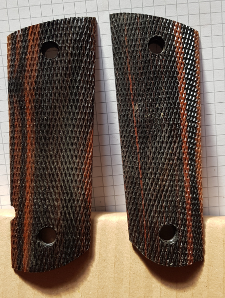 Sie bieten hier auf ein paar ( li.+re. ) Griffschalen für Colt 1911-er und baugleiche pistolen. Neu und unbenutzt. Hartholz und Checkering. Es handelt sich um exakt die Griffschalen die auf dem Bild zu sehen sind. Photo am tageslicht gemacht daswegen schatten zu sehen. Quadratische Hintergrund = 5 mm Raster. Weitere Fragen, Bilder etc. gerne jederzeit per Anfrage hier. Versand per DHL mit Send.Nr. oder auch nach Wunsch. Mfg.