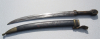 Leder bezogene Holzscheide mit Messingbeschlägen und Halteleder.