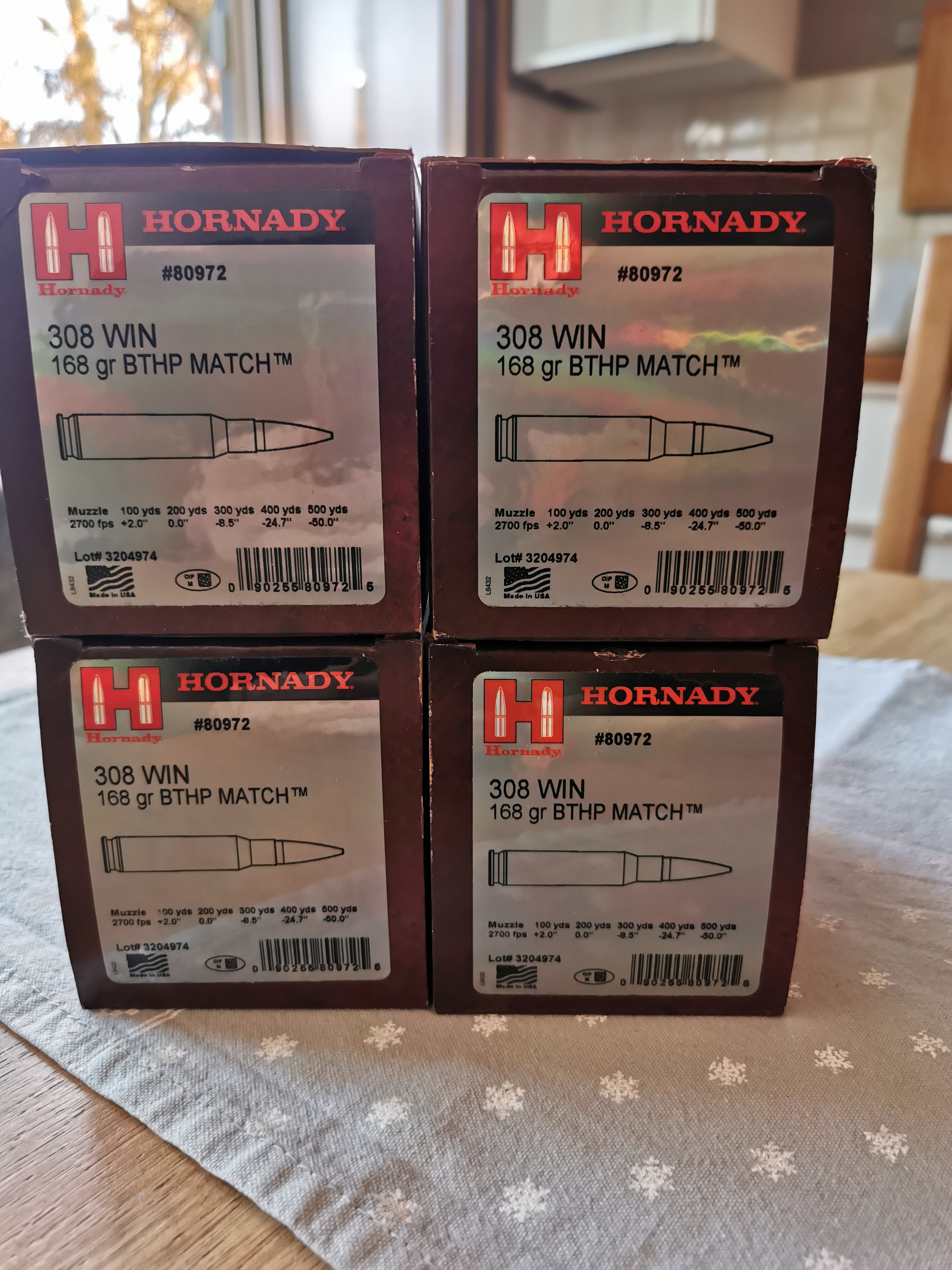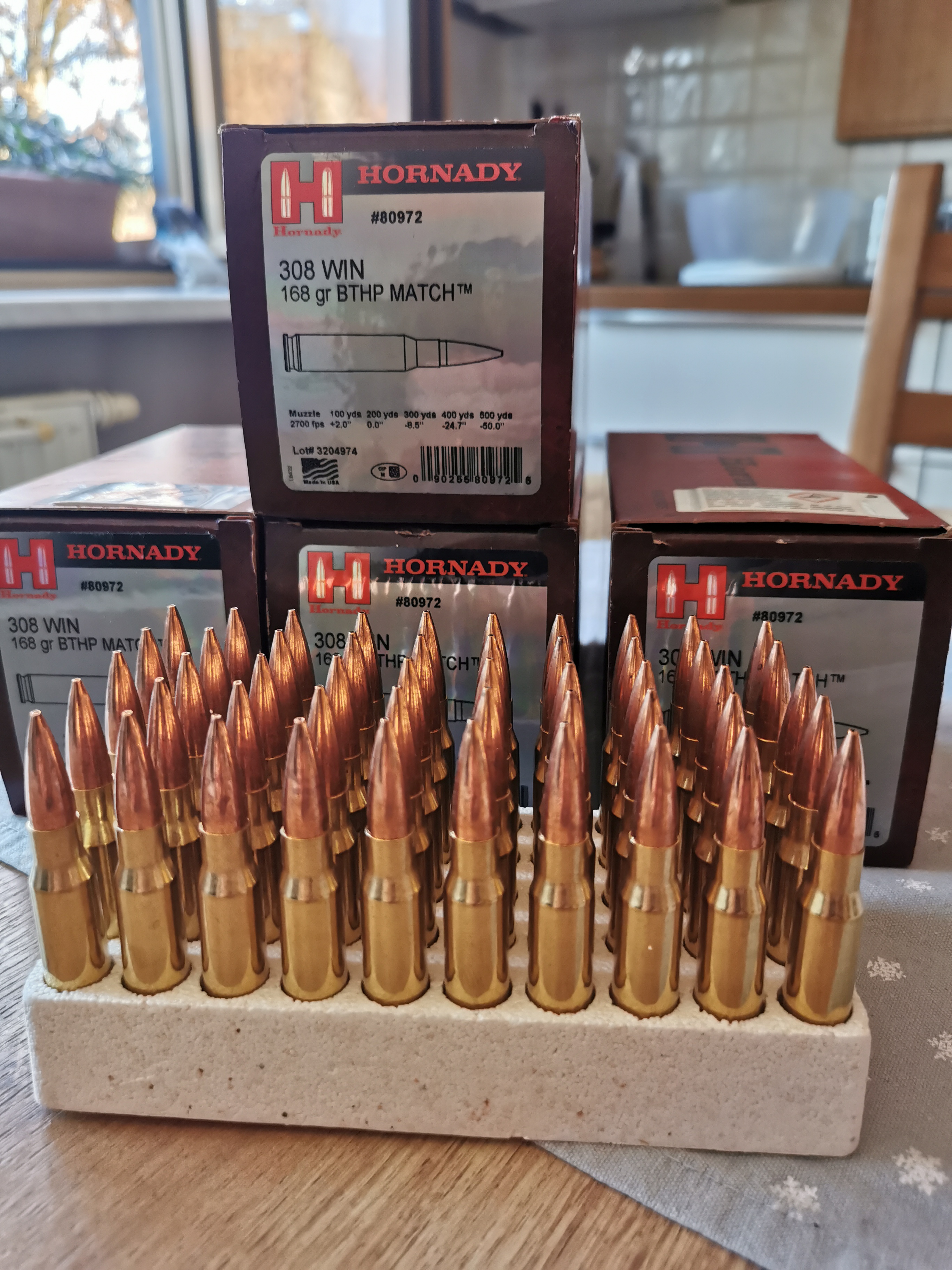 Verkaufe wegen Kaliberwechsel Restbestände an Matchmunition. Ich biete hier 200 Schuss von Hornady 168gr HPBT Matchmunition an. Die Hülsen habe ich im Anschluss zum Wiederladen genutzt. Die 168gr Munition ist eine sehr zuverlässige und präzise Munition.