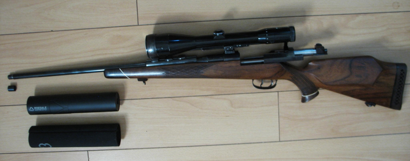 Schalldämpfer: top SD der Fa. Roedale, Typ: Hunter 50+, Kalibergruppe: 7-8mm, mit schwarzer Neoprenhülle. Ein Top-Schalldämpfer in seinem Segment!