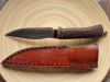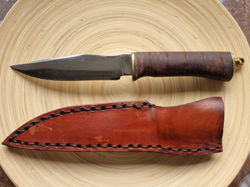 Ich konnte von einem Hagener Schmied dieses beeindruckende Jagdmesser erhalten. Dieser hat das Messer aus Hagener Eisenerz aus der Volme geschmiedet und die Scheide ebenfalls eigenständig aus Leder hergestellt. Eine ordentliche stabile Fangriemenöse ist ebenfalls vorhanden. Im Klingenrücken befinden sich die Riffelungen für die Daumenauflage (Jimping).