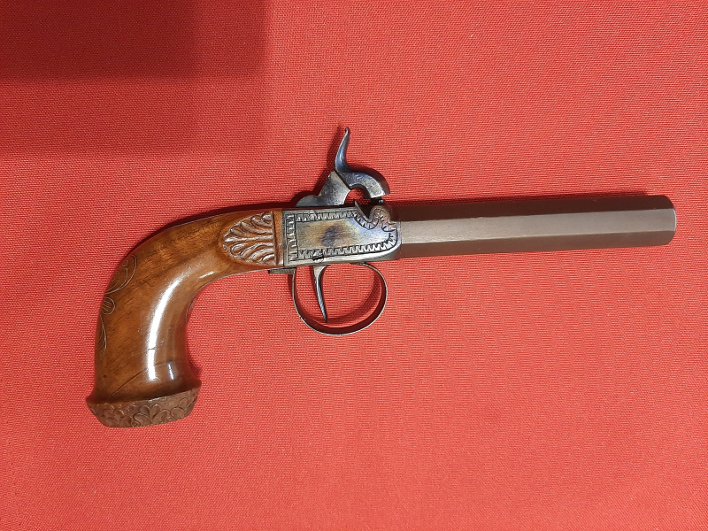 Großer Perkussionsterzerol mit buntgehärtetem Kastenschloss und brauniertem, glatten 8 Kantlauf im (Schrot?) Kaliber 14mm. Hersteller und Herstellungszeitraum mir unbekannt.