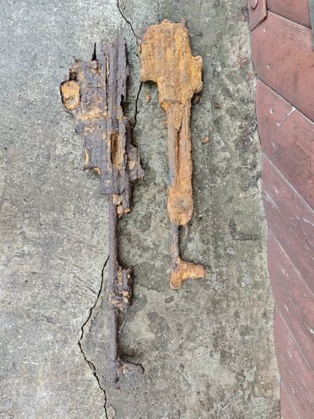 Die Teile sind schwer verrostet, teils zerfallen und stark deformiert, wie auf den Fotos gut zu erkennen ist.