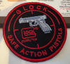 Zum Verkauf steht ein Patch zum Aufbügeln mit Motiv „Glock Safe Action Pistols“ in den Farben Rot / Schwarz, inklusive stilisiertem Glock 17 Pistolen-Logo.