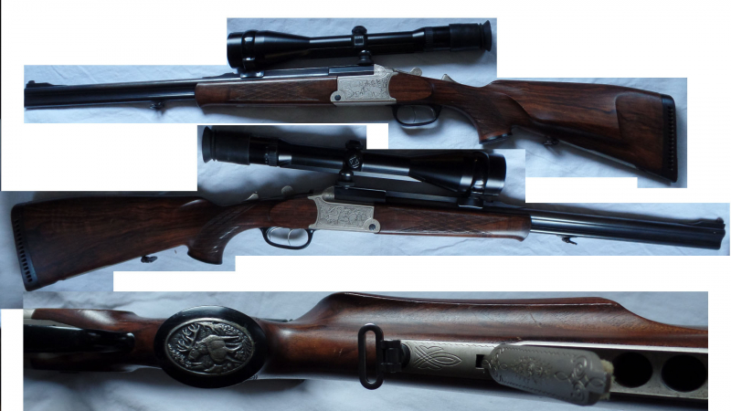 mit Innenschiene und Schwenkmontage das Absehen ist 1. Bayrische Backe mit edelem Schaftholz (Klasse ist mir nicht bekannt). Seitenplatten mit tiefen Jagdmotivgravuren. Pistolenkäppchen mit Hirschmotiv und Schaftmagazin für beide Patronensorten. Freischwingender Lauf im Kaliber 5,6, dieser lässt sich punktgenauf auf die große Patrone einstellen. Einstellanweisung ist dabei. Munition auf welche die Waffe eingeschossen ist wird auch noch mitgeliefert.