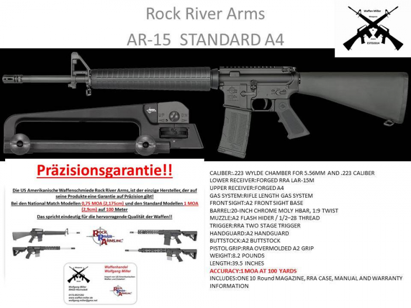 Biete ein AR15 im Kaliber .223Rem. Modell A4 Standard des US amerikanischen TOP Herstellers Rock River Arms! Sie werden mit dieser Waffe jeden anderen Selbstlader in Punkto Präzision und Verarbeitung schlagen! Kein Oberland, Schmeisser, Windham, Hera!!! Die Waffe verfügt über einen 20-INCH Chrom Moly Lauf , 1:9 , , RRA TWO STAGE Ultra MATCH Abzug und 10 Schuss Magazin! Die Waffe wird im Rock River Koffer geliefert! Bitte vor dem Kauf Kontakt zu mir aufnehmen! Ein kostenloses Einlagern bis zur EWB ist kein Problem! Rock River Arms gehört zu den besten Waffenherstellen Weltweit und ist in den USA die Nummer 1 Sie werden keine bessere Waffen bekommen! Auch andere Modelle in verschiedenen Kalibern des Herstellers lieferbar! Lieferzeit und Preis bitte anfragen!!!!!! WWW.Waffen-Miller.de Rock River Arms ist einer der Weltweit besten Waffenhersteller, sollten Sie mit der Waffe nicht zufrieden sein, nehme ich sie wieder zurück(qualitativ oder Schussleistung) !Rock River Arms ist der einzige Hersteller der eine Präzisionsgarantie von einem 1 MOA auf 100m gibt. www.waffen-miller.de Wir führen auch Waffenexporte ins Europäische Ausland durch, fragen Sie an !!