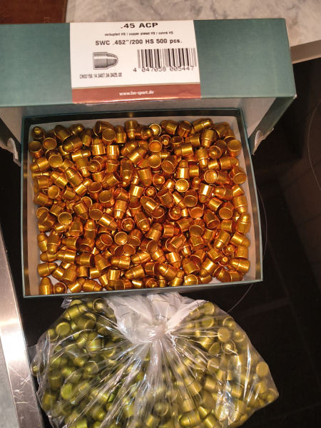 Zum Verkauf kommen insgesamt 616 Geschosse, für das Kaliber 45 ACP, Diameter .452, Gewicht 200 Grain. Es sind 378 Stück H & N High Speed Geschosse, und 238 Stück H & N Kunststoff beschichtet, Diameter .452, Gewicht 200 Grain. Sie stammen aus einem Nachlass, und werden auch nur zusammen verkauft. Der Versand ist im Preis mit enthalten, kostet nichts extra, und erfolgt per DHL.