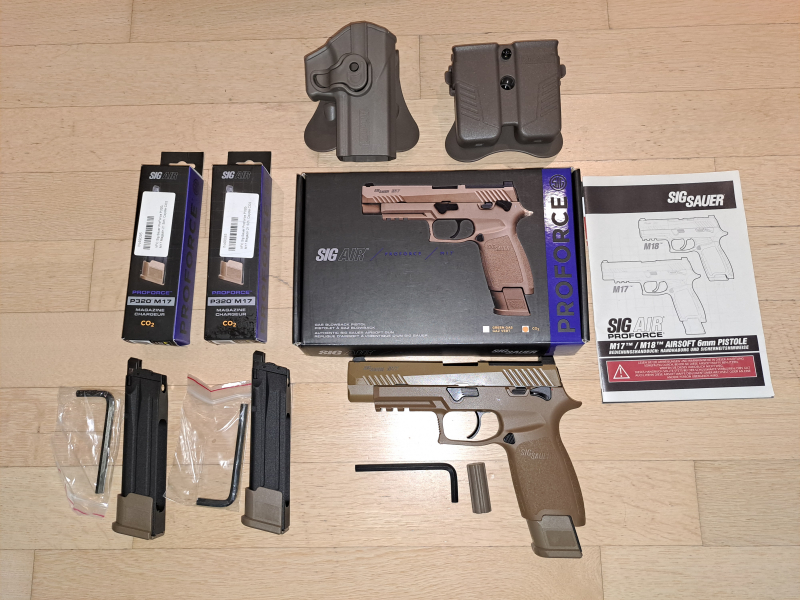 Sie bieten auf eine Sig Sauer ProForce P320-M17 mit Metallschlitten. CO2 mit BlowBack. 6mm BB in der Farbe Coyote Tan. Diese kommt im Set mit zwei zusätzlichen Sig Sauer ProForce P320-M17 Magazinen mit 21 Schuss in der Farbe Coyote Tan - CO2-Version. Dabei sind ebenfalls ein passendes Amomax Pistolenholster und ein Amomax Doppelmagazinholster. Aus meiner Sammlung verkaufe ich diese Pistole. Sie wurde wenig verwendet, wurde im Originalkarton aufbewahrt und ist in einem neuwertigen Zustand. Betrieben wird sie mit einer 12 g CO2 Kapsel. Geliefert wird 1 Stück Sig Sauer ProForce P320-M17 mit Metallschlitten CO2 BlowBack 6mm BB Coyote Tan mit Magazin, 1 Stück Werkzeugschlüssel, 1 Stück Bedienungsanleitung, 1 Stück Originalverpackung, 2 Stück Sig Sauer ProForce P320-M17 Magazin 21 Schuss Coyote Tan - CO2-Version jeweils mit einem Werkzeugschlüssel, 1 Stück Amomax Pistolenholster und 1 Stück Amomax Doppelmagazinholster. Bei Fragen gerne Fragen. Mehr Bilder sende ich ebenfalls gerne auf Anfrage. Oder kommen Sie zur Besichtigung vorbei. Abholung oder Versand als versichertes DHL-Paket für 7,69 € nur innerhalb von Deutschland. Kein internationaler Versand. Bezahlung bei Abholung oder per PayPal. Dies ist eine Privatauktion, es gibt kein Umtausch- oder Rückgaberecht. Der Artikel wurde nach bestem Wissen und Gewissen beschrieben. Mit der Abgabe seines Gebotes erklärt sich der Käufer bereit, den Artikel binnen 7 Tagen zu bezahlen. Altersnachweis erforderlich! Gemäß den eGun Statuten müssen durch eGun geprüfte Bieter (ID-Angabe beim Benutzernamen) mir gegenüber für diese Waffe keinen Altersnachweis mehr erbringen.