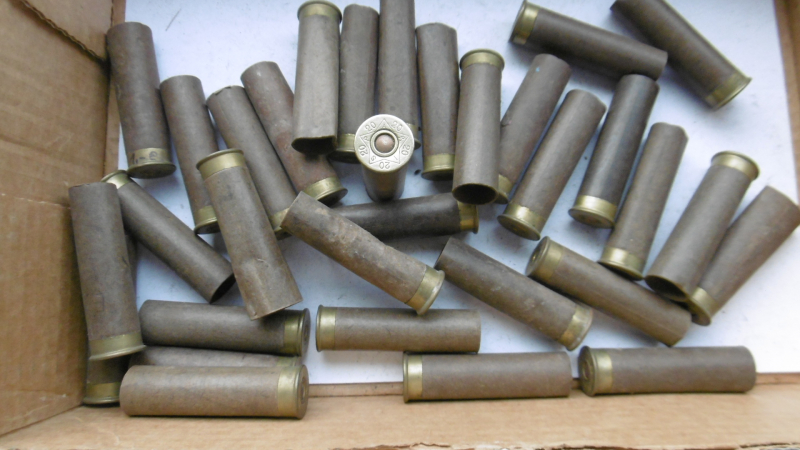 Angeboten werden 32 leere, ungebrauchte Schrothülsen Kal. 20 mit Gebrauchsspuren. Hergestellt in den 1930er Jahren in Paris.