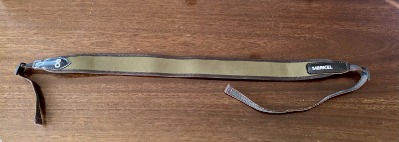 Gewehrriemen, vermutlich von Niggeloh, mit Merkel Branding im jagdlichen Grün.