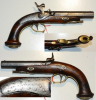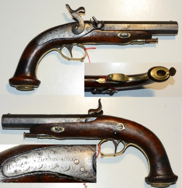 Perkussionspistole, belgischer Beschuss, möglicherweise ist die Angabe auf der Schlossplatte "Richard Buenos Ayres" nur eine Händleradresse, Lauflänge 13 cm, Gesamtlänge 30cm, Kaliber 18,3 mm, im Kolben Fach für Zündhütchen, der Lauf außen mit stärkeren Gebrauchsspuren.