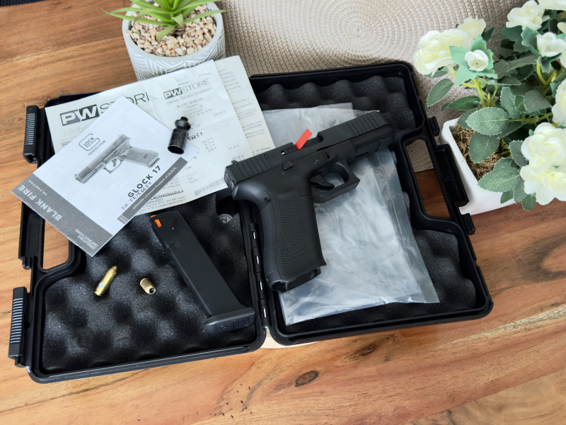 Ich biete euch hier eine Neuwertige Glock 17 Gen5 in 9mm P.A.K. mit allen Original Glock Logos, Magazin dem Original nachempfunden mit 17 Schuss-Anzeige und orangener Markierung, wenn das Magazin leer ist sowie der eckige Schlagbolzen wie beim Original.