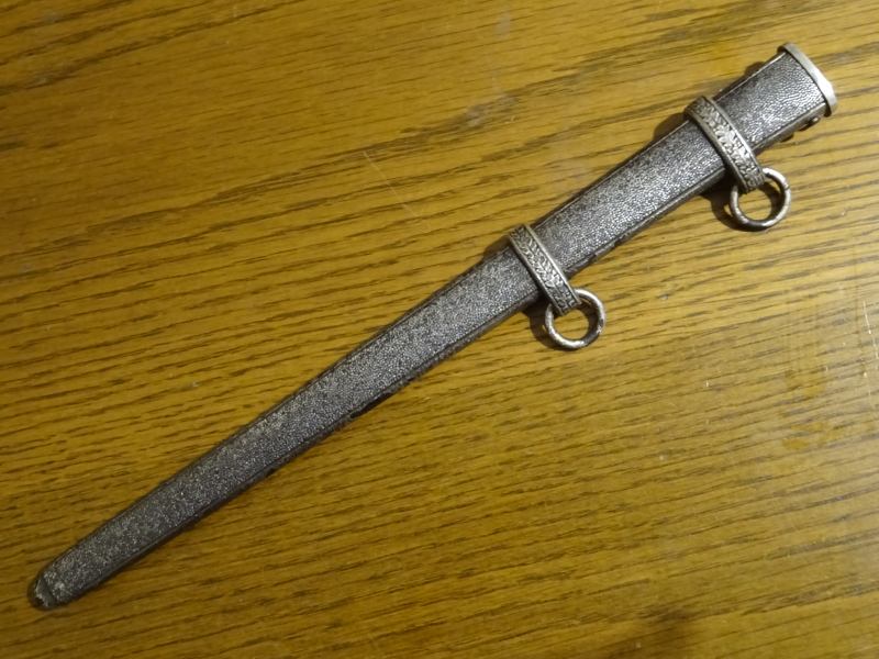 Aus Nachlass: ------- Gebrauchte Scheide von einem WKC-Solingen Dolch zu verkaufen.------- Zustand siehe Fotos. ------- Die magnetische Scheide ist aus versilberten ( oder vernickeltem ? ) Stahlblech,ohne Durchrostungen.------- Die ovalen Trägerbänder für das Gehänge sind fest mit der Scheide verbunden.------- Ich habe das Mundblech der Scheide geöffnet,und die Haltefeder für die Klinge sowie das innere der Scheide gesäubert,geölt und mit einem Endoskop kontrolliert. ------- Es war nur leichter Flugrost vorhanden. ------- Es sind keine Durchrostungen erkennbar,auch die Feder ist im guten Zustand und voll funktionsfähig ( siehe Foto ).------- Versicherter Versand mit Hermes für 5,50 Euro. ------ Achtung,vor Kauf unbedingt diesen Text lesen:------- Der Verkauf erfolgt unter Ausschluss jeglicher Sachmängelhaftung !!! -------Die Haftung auf Schadenersatz wegen Verletzungen von Gesundheit,Körper oder Leben und grob Fahrlässiger und/oder Vorsätzlicher Pflichtverletzungen bleibt unberührt !!! ------- Privatverkauf,keine Garantie,Gewährleistung,Rücknahme,u.s.w. auch nicht nach E.U. Recht !!!!!!!!!!!------ Versand auf Risiko des Käufers !!!!!!!!------Die angegebenen Versandkosten gelten immer nur für Deutschland AUSSER Inseln !!!!!! -------Die Bilder sind verbindlicher Bestandteil der Artikelbeschreibung,bei Unklarheiten und Fragen bitte unbedingt vor Kauf oder Gebot nachfragen ! --------- Das ist ein Privatverkauf im Sinne des § 3 Abs. 5 des Fernabsatzgesetzes, kein Widerrufsrecht, keine Gewährleistung!-------Die Rückgabe, Wandlungs- oder Umtauschmöglichkeit des ersteigerten oder per sofortkauf erworbenen Artikels ist ausgeschlossen.------- Da ich Privatverkäufer bin,weise ich darauf hin, dass ich nicht an das Produkthaftungsgesetz (BGB §§ 312 b ff.) gebunden bin und somit ebenfalls von der Erfüllung jeglicher Garantie- und Gewährleistungansprüche aus § 438 Abs. 1 Nr. 3 BGB ausgenommen bin.-------Ich versende grundsätzlich NUR versichert.------- Bei Beschädigung oder Verlusst der Ware während des Transportes hafte nicht ich,sondern nur der Versanddienstleister!------- Geht die Sendung auf dem Postweg verloren, wird von mir kein Ersatz geleistet.------- Sollte die Ware aus irgendwelchen Gründen nicht zustellbar sein ( Umgezogen,falsche Adresse usw. ), trägt nur der Käufer alle weiteren zusätzlichen Versandkosten.