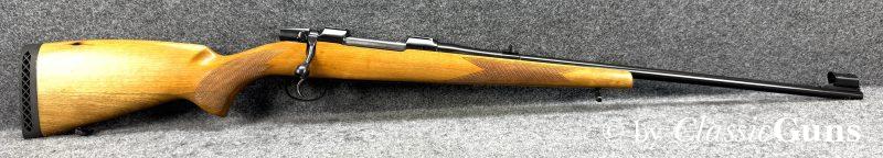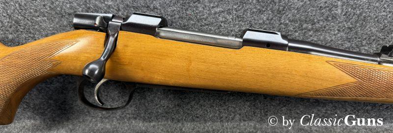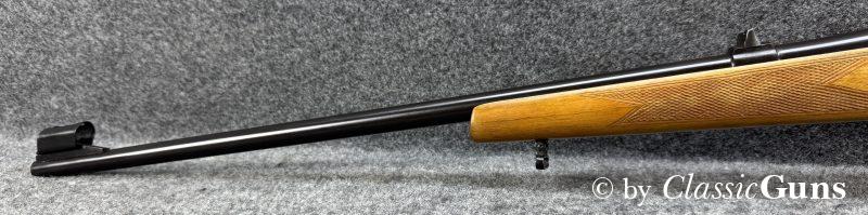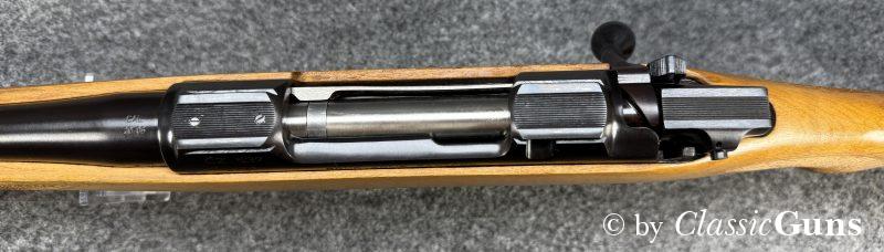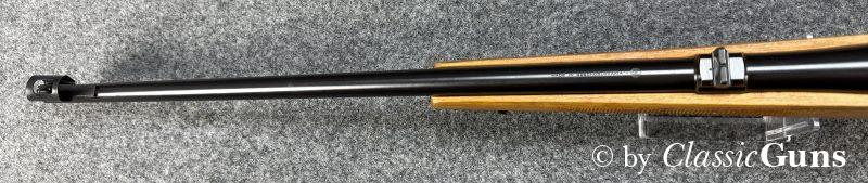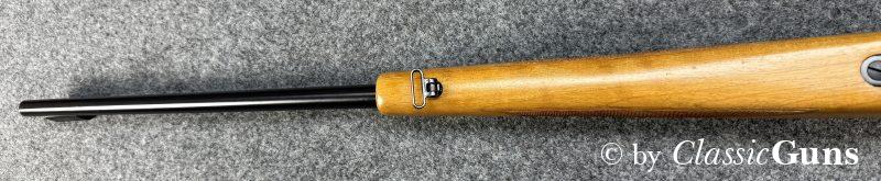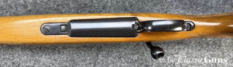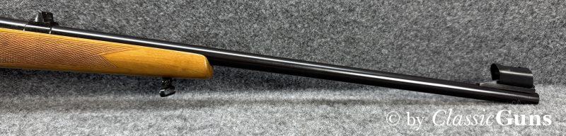 600 mm langer Lauf mit neuwertigem Zug-/ Feldprofil. Erstklassig erhaltene Brünierung mit nur minimalen Gebrauchsspuren. Lackierter Nussbaumschaft, ebenfalls mit nur minimalen Gebrauchsspuren. Klappdeckelmagazin für fünf Patronen. Druckpunktabzug mit Rückstecher (Kombiabzug).