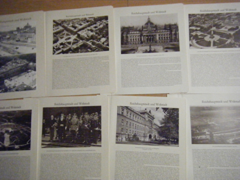 8 Bilder, Berlin Reichshauptstadt und Weltstadt. ( Regierungsviertel um Wilhelmsplatz 1933, Reichstagsgebäude 1925, Platz der Republik mit Reichstaggebäude und Siegessäule 1929, Reichssportfeld 1936, Amtseinführung der Staatskommissars 1934, Reichsministerium des Innern 1935, Zentralflughafen tempelhof 1930, sowie der Pariser Platz 1935 . Die Bilder sind schwarz weiß mit entsprechenden Erläuterungen. Berlin Archiv FAKSIMILE . In Sammlerhülle mit Erläuterungen auf dem tranparenten Umschlag. Zustand sehr gut.. Reproduktion wichtiger Dokumente der Geschichte