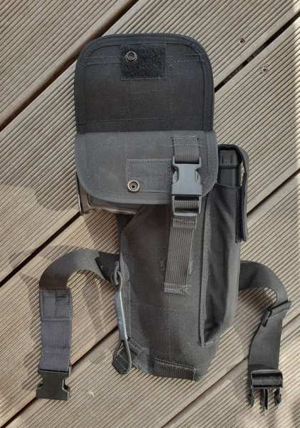 Taktisches Drop-Leg Holster aus schwarzem Cordura für HK Mk23 SOCOM mit höhenverstellbarem Beinriemen, Militärkoppelbefestigung und langer Seitentasche für Schalldämpfer / Ersatzmagazin. Das Holster läßt sich unten öffnen um es mit montiertem Schalldämpfer und Lichtmodul nutzen zu können. Durch die zusätzliche Klappe ist das Holster „Airborne – Jumpable“. Es paßt wie auf den Bildern zu sehen auch für Desert Eagle Pistolen. Hergestellt von London Bridge Trading / USA. Das Holster ist unbenutzt und der Neupreis liegt bei über $300. Privatverkauf