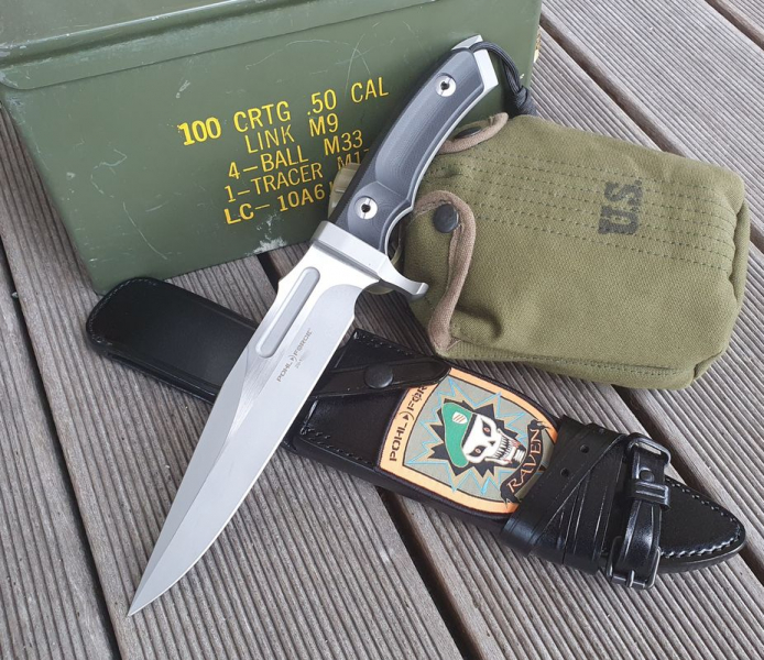 Pohl Force MK8 Movieknife. Von Dietmar Pohl für das finale Rambo-Kapitel „Last Blood“ entwickeltes Kampfmesser. Inklusive Lederscheide, Echtheitszertifikat und diverser Patches. Das Messer ist im Handel nicht mehr erhältlich.