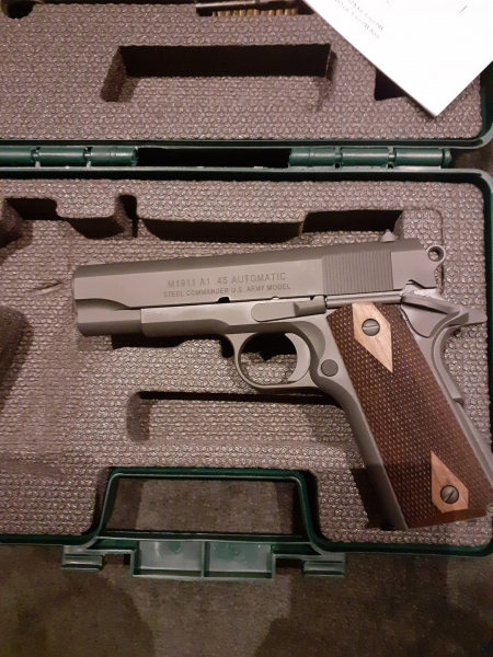 Angeboten wird ein fabrikneuer Combat Commander in Vollstahl und mit Holzgriff in 9mm PAK in OVP und mit vollständigem Zubehör. (Neupreis 1.050,-)Die Waffe wurde weder geschossen noch geführt noch bespielt, sondern lediglich auf Trockenfunktion getestet. Alles funktioniert, lediglich das Magazin kann ich nur mit 7 Patronen befüllen - bei mehr Patronen hakt es beim Einführen in die Waffe. Den Grund weiß ich nicht. Gegebenenfalls kann man ein neues Magazin für 89,- beim Händler nachkaufen. Sicherheitshalber spreche ich von minimalen Lagerspuren ab Werk.
