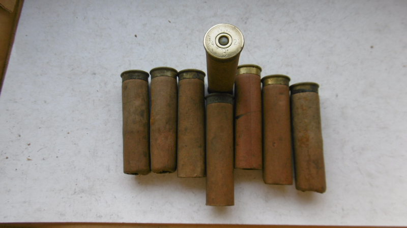 Angeboten werden 8 leere, ungebrauchte Schrothülsen Kal. 24. Bodenstempel: WM 24 B 24, eine Fertigung der Patronenhülsenfabrik Bischweiler/Elsass -Walbinger&Meuschel- vor 1914. Die Hülsen lagerten auf dem offenen Dachboden der Büchsenmacherei ERDELT in Neustadt/Haardt (Weinstraße). 100 Jahre Schmutz habe ihre Spuren hinterlassen die noch zu entfernen sind.