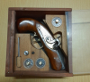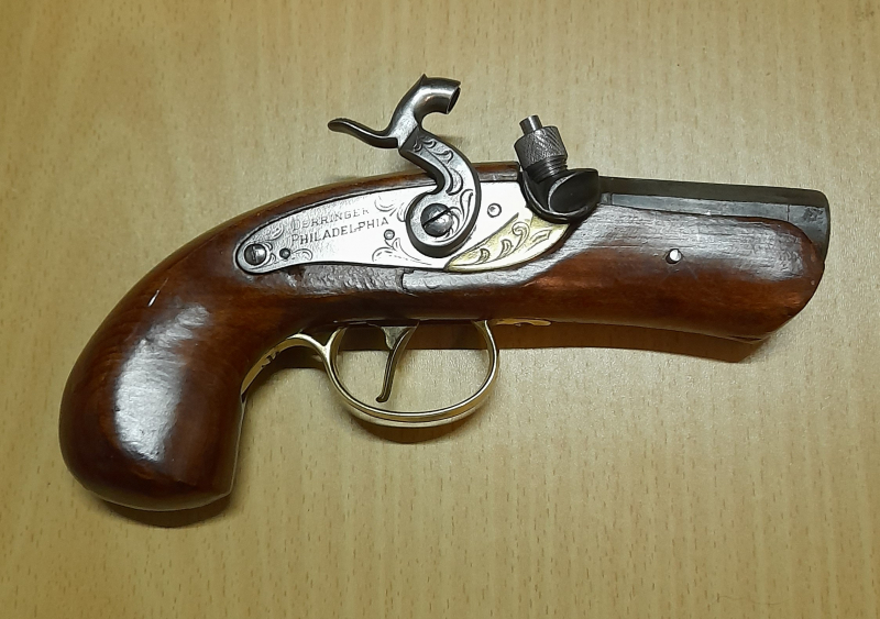ich biete ihnen hier eine Indoor Vorderlader Pistole - Philadelphia Derringer von Dikar im Kaliber 4,5mm an. Ich habe die Waffe 1995 von einem alten Schützenkollegen erworben. Da mit dem Original kleinem Piston und passenden Zündhütchen die kleinen Bleikügelchen nicht verschossen werden konnten habe ich mir von einem Büchsenmacher, weil ich keinen für das Gewinde des Derringer passenden Zündhütchen Halter für Schrotzünder bekam einen für den diesen Derringer neu machen lassen, danach aber relativ wenig geschossen, daher ist sie in einem guten Technischen Zustand. Zu dem Derringer gehört auch der kleine Vitrinenkasten nebst dem im Bild zu sehenden Inhalt. Leider hat der Kasten über die Jahre etwas gelitten und die Scheibe einen durch Unachtsamkeit einen Riss bekommen. Bitte sich die Bilder ansehen sie sind Teil der Beschreibung, sie kaufen das was sie sehen, auf Wunsch kann ich aber noch welche zusenden. Hier noch ein Hinweis aus gegebenem Anlass – Sie ist Alt – ist nicht Makellos – hat sicherlich den einen und anderen Fehler – ich beschreibe hier nicht jede Kleinigkeit, Fragen stellt bitte vorher wer damit nicht einverstanden ist bitte nicht bieten