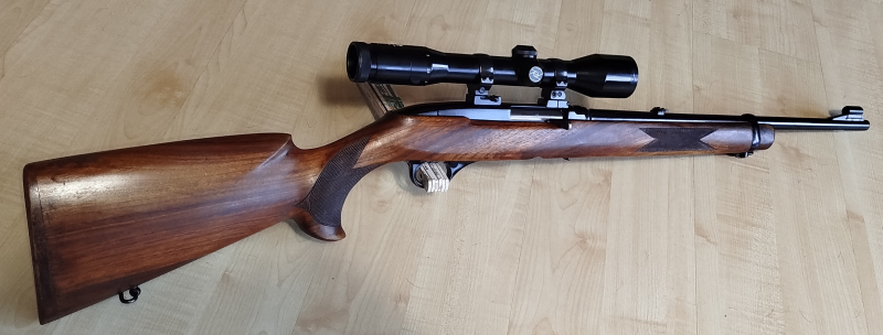 Selbstladebüchse Winchester 100 im Kaliber .308 mit Holzschaft, Kaisergriff und schöner Schaftbacke. Variables Zeiss Zielfernrohr 1,5-6x42 mit Drückjagdabsehen ohne Leuchtpunkt. Bei der Montage müsste es sich um eine EAW handeln. Magazin für 4 Patronen + eine Patrone im Patronenlager. Offene Visierung und Riemenbügel. Kein Mündungsgewinde. Das Kaliber .308 ist ideal für kurze Läufe geeignet. Im Bereich der Eichenlaubapplikation war der Schaft beschädigt und wurde lt. Vorbesitzer vom Büchsenmacher nachgearbeitet. Wenn man es nicht weiß, ist die Stelle eigentlich unauffällig. Siehe Bild. Gesamtlänge ca. 99 cm. Abstand Abzug zu Mitte Schaftende 33,5 cm. Lauflänge ca. 47,5 cm. Zustand siehe Bilder. In meinen Augen eine sehr führige und schöne Waffe, die nicht auf den ersten Blick als Selbstladebüchse erkennbar ist und sich positiv von militärischen Selbstladebüchsen abhebt.