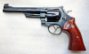 Hervorragend gefertigter Revolver in bester S&W-Qualität. Wohl nur sehr wenig geschossen. Perfekter Schlossgang und Abzugverhalten. Bunt gehärtete Schlossteile. Breiter Abzug. Fein justierbare Mikrometervisierung. Hochglanzbrünierung. Spiegelblanker 6,5" langer Lauf. Rutschfeste Holzgriffschalen. Sechsschüssig. Natürlich ohne Magnumrille. Mit aktuellen deutschen Beschuss. Komplett mit Bedienungsanleitung und allen Dokumenten.
