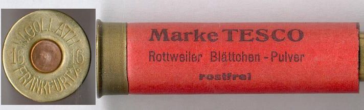 Angeboten wird 1 leere, ungebrauchte Schrothülsen Kal. 16 in neuwertigem Zustand, Marke TESCO, hergestellt vor 1928 von Wilh. Collath & Söhne in Frankfurt/Oder.