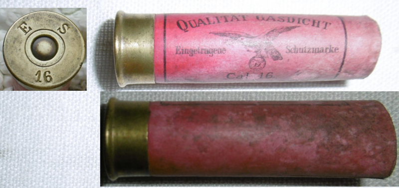 Angeboten wird 1 leere, ungebrauchte Schrothülsen Kal. 16. Bodenstempel: E S 16 Das Firmen-Logo auf der Seiti ist das eingetragene Warenzeichen der "Rheinischen Sprengkapselfabrik in Küppersbusch (nahe Köln). Der Inhaber war Ernst Schreiner. Hergestellt von der Badischen Munitionsfabrik in Durlach, die ebenfalls Ernst Schreiner gehörte. Das erklärt der Bodenstempel. Eine Fertigung vor 1904.